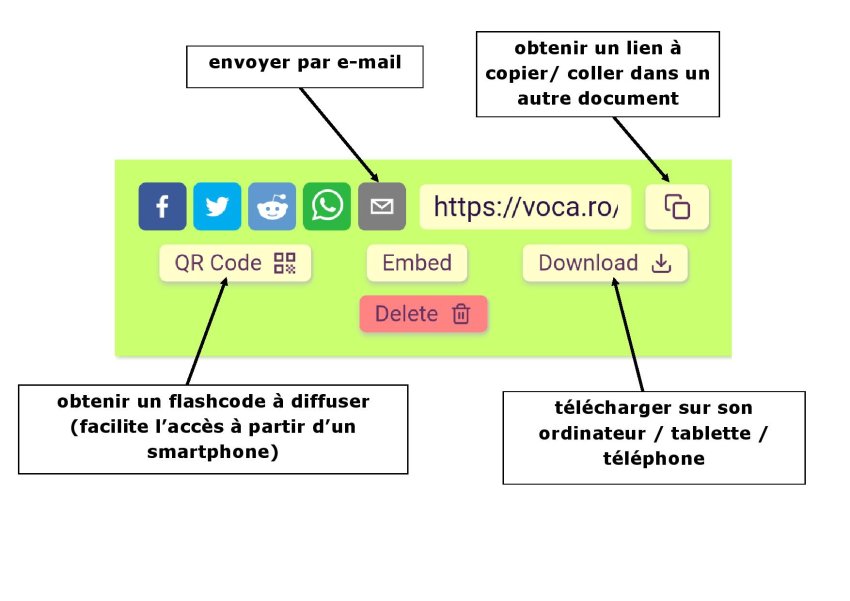 • de diffuser le document audio obtenu de différentes façons (en particulier : lien direct à copier, e-mail, flashcode), pour l’écouter en ligne et/ou le télécharger au format .mp3