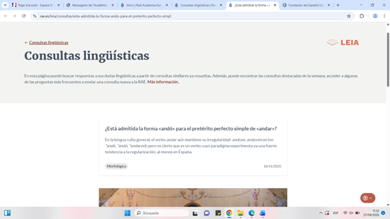 La Real Academia Española de la Lengua propose depuis peu un nouvel outil permettant de poser à leurs équipes de linguistes des questions sur la langue, LEIA, complémentaire de fundéuRAE, buscador urgente de dudas, que proposait déjà l’agence d’information EFE en collaboration avec la même RAE. L’un comme l’autre de ces deux outils proposent une base de données avec des réponses déjà données aux utilisateurs sur des doutes linguistiques fréquents, ainsi que la possibilité de contacter les équipes via des formulaires